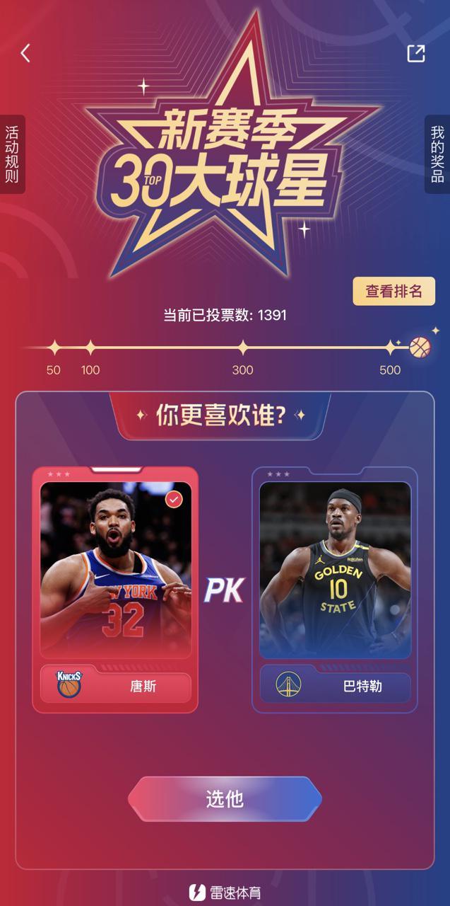 第一阶段的海选活动于10月14日14:00正式开启,广大老哥们可以从雷速编辑部根据用户搜索习惯以及喜爱程度选出的NBA球员大底池中进行两两PK,选出你心目中更喜爱的那个TA,根据两两PK的胜率得出最终的排名,排名前50的球星将会进入最终的投票阶段,第一阶段的海选将于明日17日的0点结束。